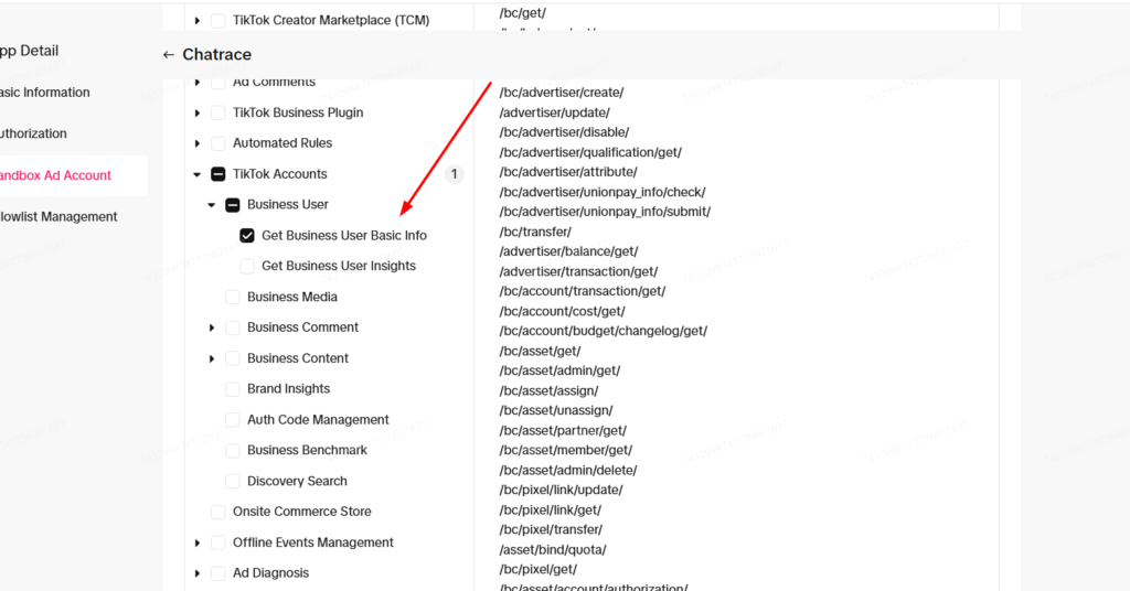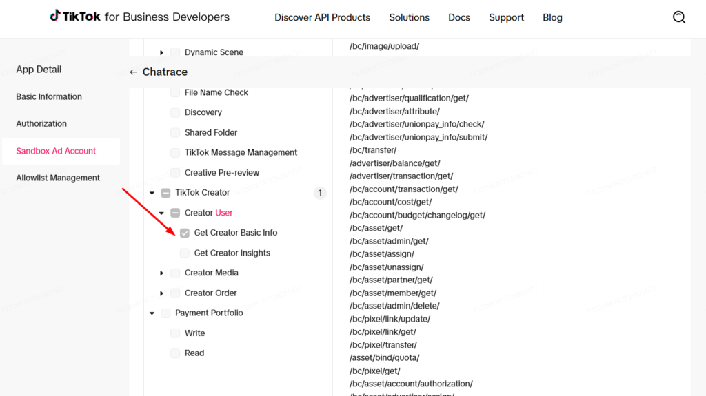 Include “Ad Account Management“, “CTX Events Management“, “Measurement“, and “TikTok Creator > Get Creator Basic Info” scopes of permission in your application.