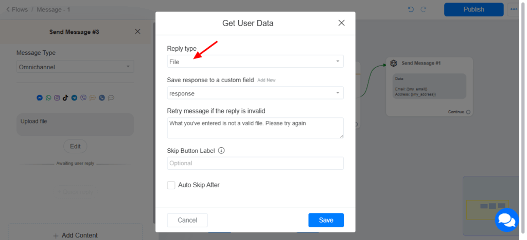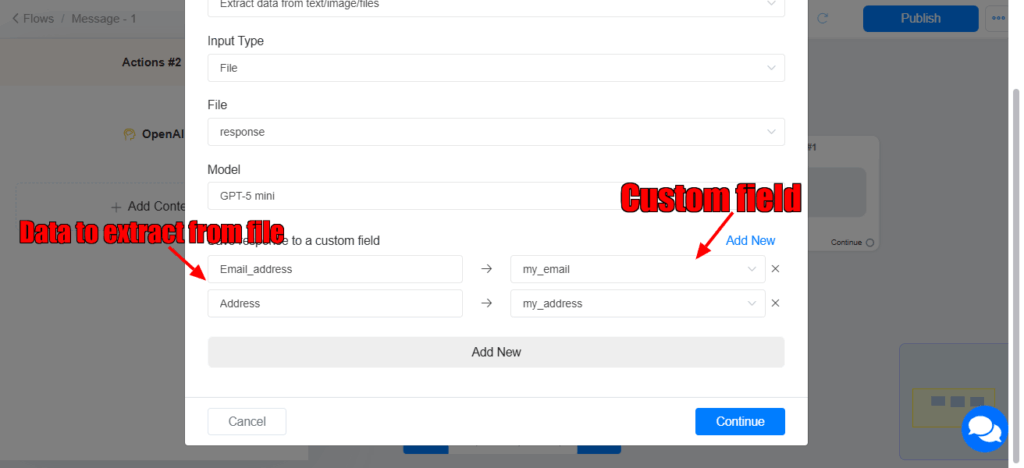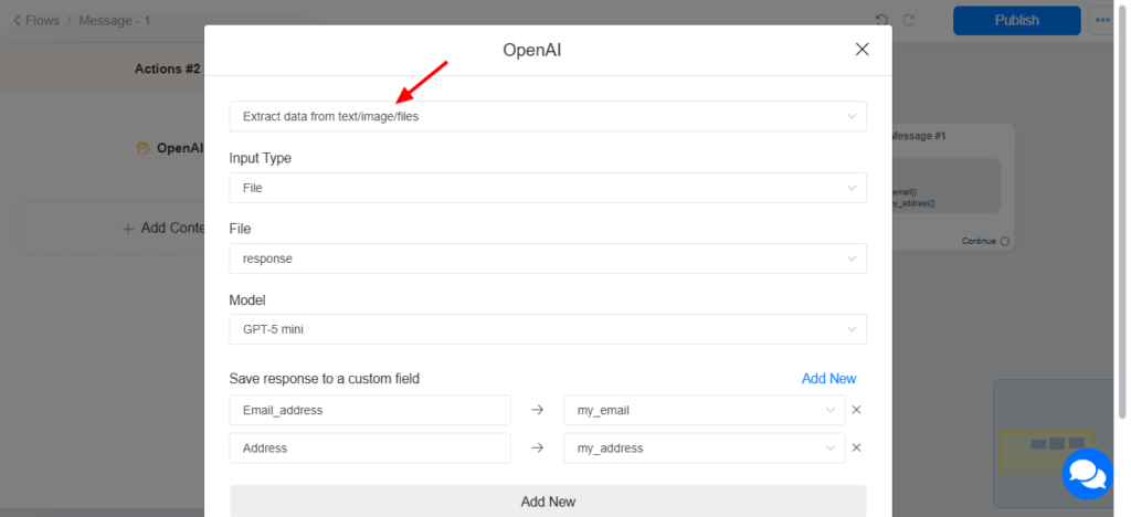 - In your flow, collect the file from your user and read the file using OpenAI action (Extract data from text/image/files).